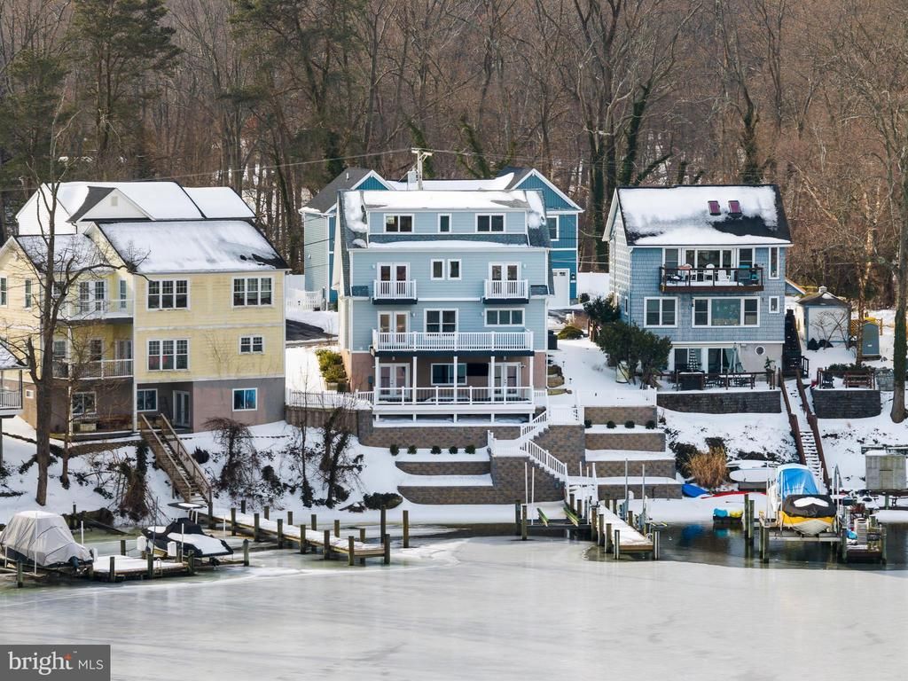 Perched along the waterfront of Cool Spring Cove, this thoughtfully enhanced residence delivers a seamless blend of comfort, recreation, and effortless coastal living, where extensive upgrades elevate both daily enjoyment and entertaining. The outdoor environment has been carefully curated to maximize time on and around the water, with redesigned hardscaping, custom lighting, lush landscaping, and irrigation creating a polished yet low-maintenance setting. Expansive multi-level decking invites gatherings of every scale, featuring a fully rebuilt lower deck with a private hot tub retreat and sleek, unobstructed railings that preserve water views, while the upper deck’s remote-controlled awning allows for shaded relaxation during warm summer afternoons. The private pier system transforms the property into a true boating and waterfront lifestyle hub, featuring a 12,000-lb boat lift capable of accommodating a substantial vessel, dual jet ski lifts for spontaneous adventures, upgraded electrical service, and convenient water access via an integrated ladder. Thoughtful additions such as docking bumpers, cleats for visiting boaters, and live well and crabbing accommodations create the ideal setting for sunset cruises, weekend water sports, and enjoying the Chesapeake’s renowned crabbing traditions. Inside, extensive interior enhancements enrich everyday living while providing exceptional spaces for hosting. The main level layout flows seamlessly from the dining area, living room with fireplace and the spectacular white kitchen with large island and fabulous views. The finished lower level is designed as an entertainment destination, showcasing a custom bar with refrigeration, keg chiller, dishwasher, and ice maker, along with a theater room, gathering lounge, and spa-inspired full bath that offers guests and residents alike a resort-style experience. The primary suite boasts exceptional water views and provides a luxurious escape with cherry hardwood flooring, custom closet, conveniently located laundry room and a stunning spa-like bath with free-standing soaking tub overlooking the water. 2 additional bedrooms on this level and an expansive additional upper level with full bath, views and plenty of space; provides ample options for accommodating family and friends. Together, these extensive improvements create a turnkey waterfront sanctuary designed to support an active boating lifestyle, memorable entertaining, and relaxed everyday living. Welcome Home!