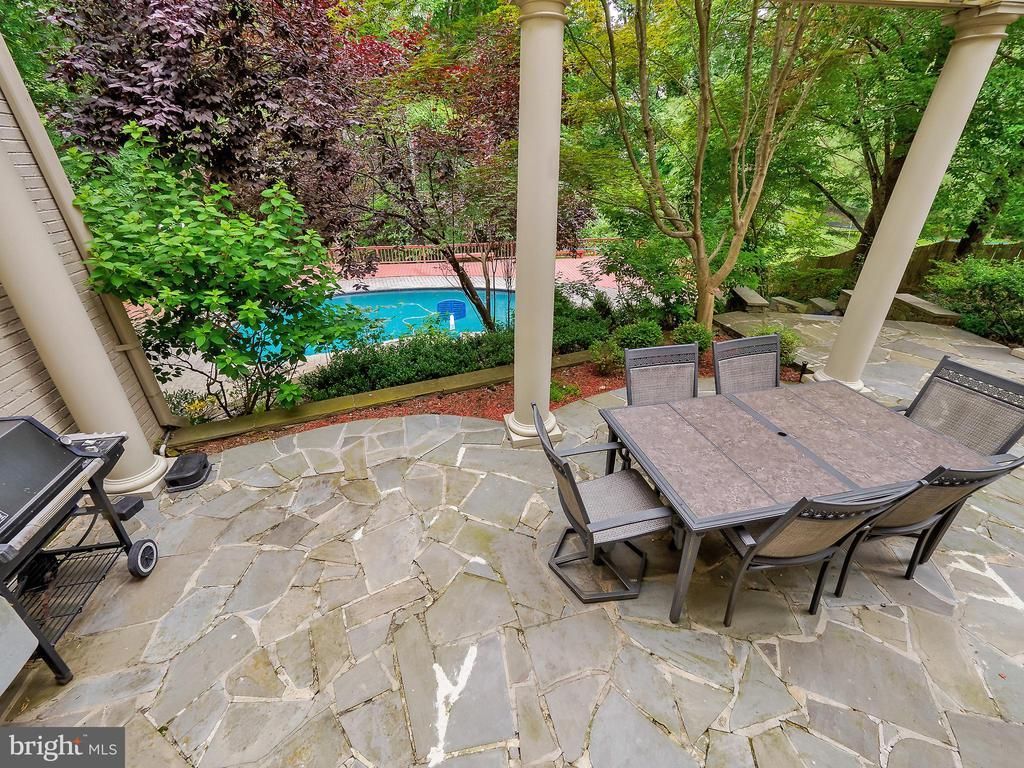 This stately residence with an inground pool offers nearly 8,000 square feet and blends timeless architecture with exceptional craftsmanship. Truly move-in ready, the home makes a striking first impression with a dramatic two-story marble foyer and statement chandelier. The main level features soaring ceilings, rich hardwood floors, detailed moldings, and custom window treatments throughout. Designed for both grand entertaining and everyday living, the open floor plan includes a formal living room with fireplace and expansive windows, flowing seamlessly into the elegant dining room with custom built-ins and wet bar. The gourmet eat-in kitchen is outfitted with a large center island, granite countertops, stainless steel double wall ovens, two dishwashers, and a secondary refrigerator — ideal for hosting. Just off the kitchen, the spacious family room is wrapped in windows on three sides, offering abundant natural light and tranquil views of the private rear grounds. A refined mahogany library with custom built-ins and fireplace, powder room, laundry room, and oversized two-car garage complete the main level. Upstairs, the expansive primary suite offers a sitting area with fireplace, generous walk-in closets, and a luxurious spa bath featuring a soaking tub, dual vanities, and separate shower. Three additional well-appointed bedrooms each include updated en-suite baths. The fully finished, walkout lower level is expansive and versatile, featuring an in-law suite with full bath, fireplace, wet bar, wine cellar, additional bedroom, recreation space, and abundant storage. Walls of sliding glass doors open to a private backyard retreat with a stunning in-ground pool and stone terrace — a true outdoor oasis. Ideally located just minutes from downtown Bethesda’s shops, dining, and conveniences, with easy access to Washington, DC, Northern Virginia, and major commuter routes, this exceptional property also offers proximity to parks and recreation.